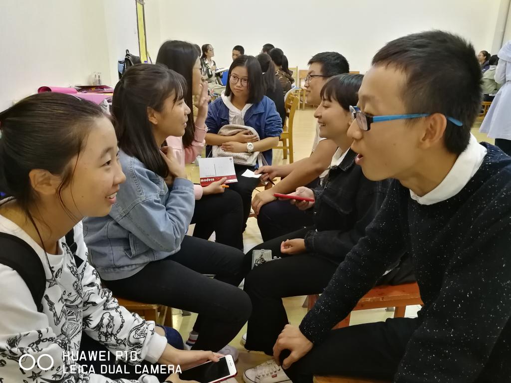 活动以游戏的形式开展了一系列互动环节,寓教于乐,使同学们在轻松愉悦的氛围中受到培训。鉴于新生刚入学不久,与本班同学的交流机会较少,因此活动采用循序渐进的方式来增强成员之间的交流程度与集体意识。第一个环节是一分钟鼓掌,新学期,同学们在热烈的掌声中开始,所有同学都对自己的能力过低,最多只估计了100下。通过此环节,同学们明白了制定一个合理目标的重要性;第二环节为“我知道”,此环节气氛热烈,一场过后,已有部分同学聊天意犹未尽互相加QQ号或者微信号。第三个环节为“信任之旅”几乎所有“盲人”都找到了自己的“引路者”,在后面的“集体登陆”、“人体字母”、“人椅破冰”几个环节中,同学们展现出了非凡的毅力与创造力,场中欢笑与惊叹声不绝于耳。活动进行到“信心启迪”、“快乐传递”环节时,彼此之间最初的隔阂和距离早已没有,各种担忧和烦恼也随笑声欢呼声而逝,团队凝聚力不断上升。最后,各组分别在彩色纸上绘制本组的团体树,彩纸上写满了大家的名字、对彼此的祝福,以及对未来的憧憬。活动结束时,同学们很积极地同一幅幅充满凝聚力的团体树进行合影留念。