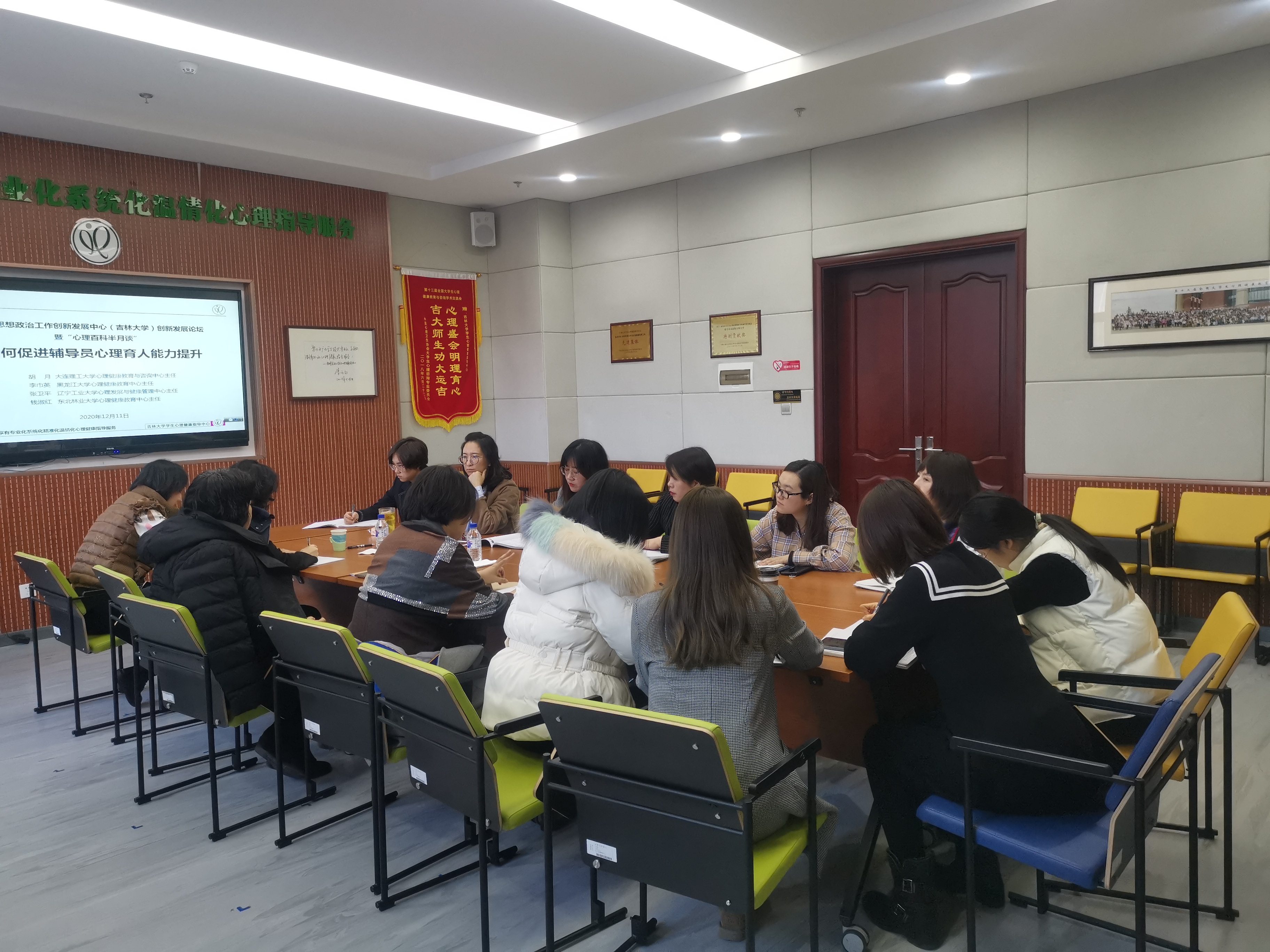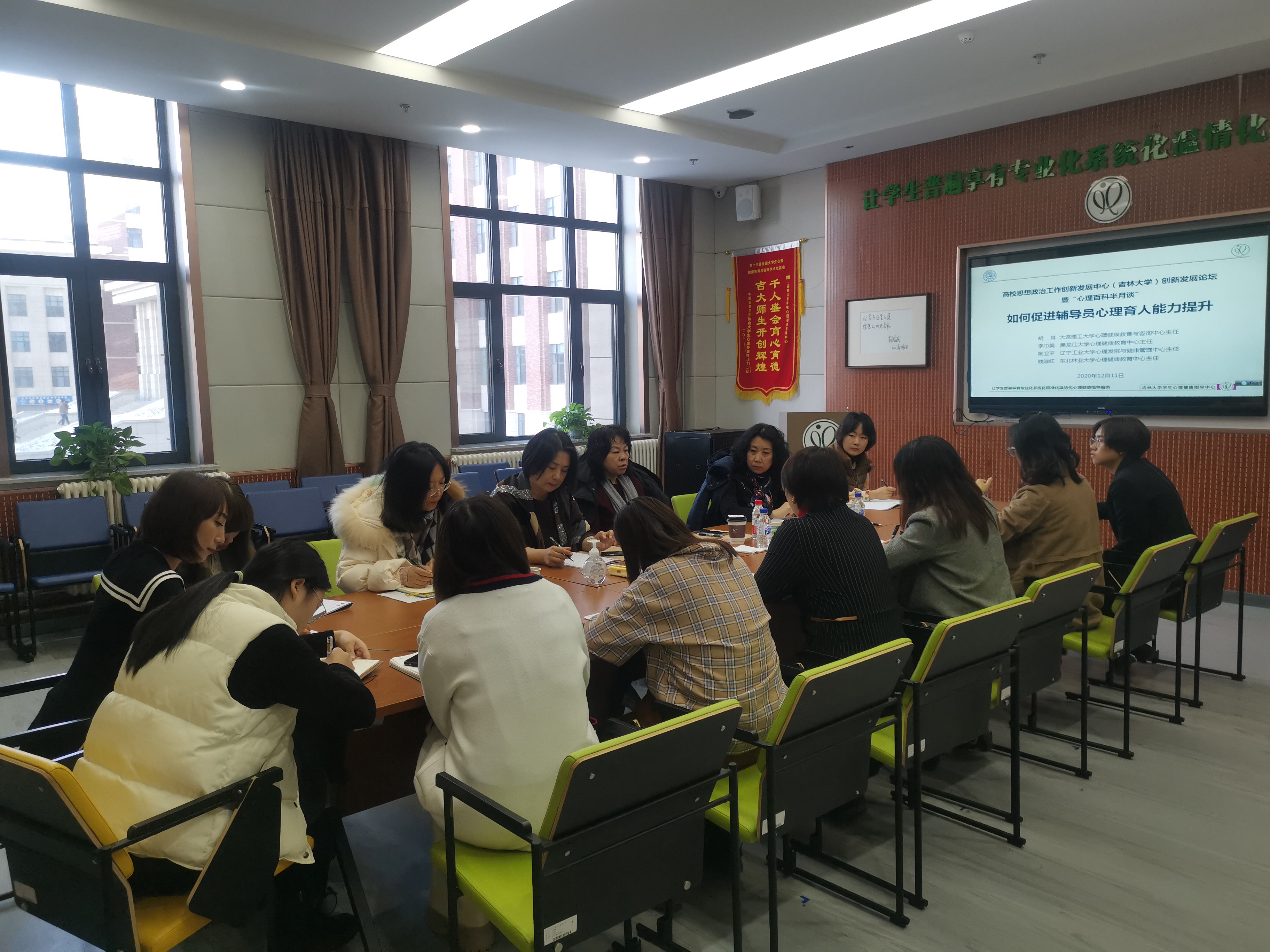 为探索辅导员开展心理育人工作的有效路径,进一步提高我校学生工作队伍心理育人工作水平,2020年12月11日,学生心理健康指导中心邀请大连理工大学心理健康教育与咨询中心主任胡月、黑龙江大学心理健康教育中心主任李巾英、辽宁工业大学心理发展与健康管理中心主任张卫平、东北林业大学心理健康教育中心主任钱淑红等四位老师,在鼎新楼C228多功能培训室举办“如何促进辅导员心理育人能力提升”主题论坛。论坛由中心副主任朱丽雅老师主持,中心专职心理健康教育教师参加了此次论坛。