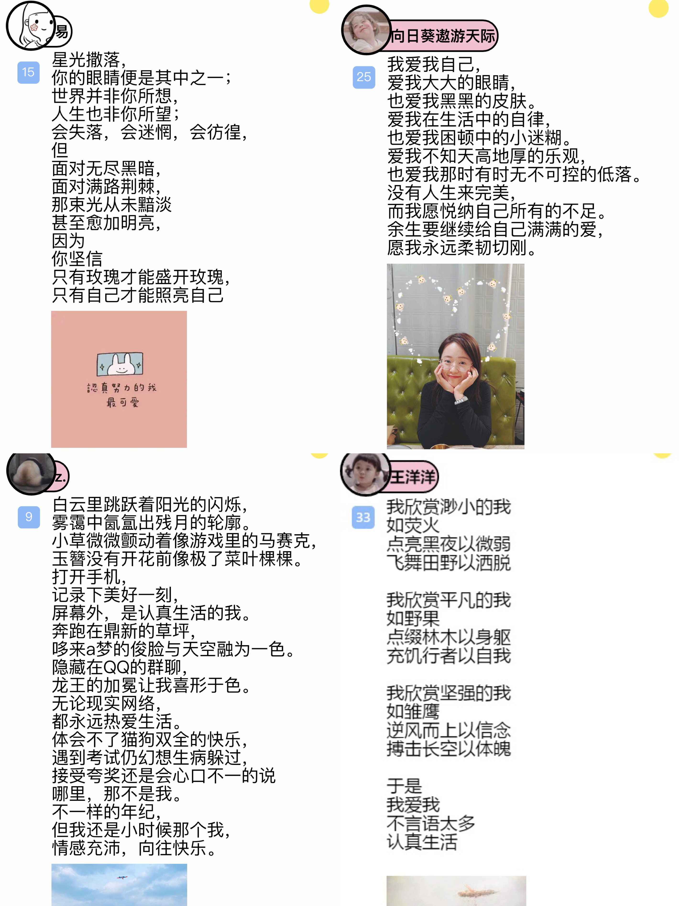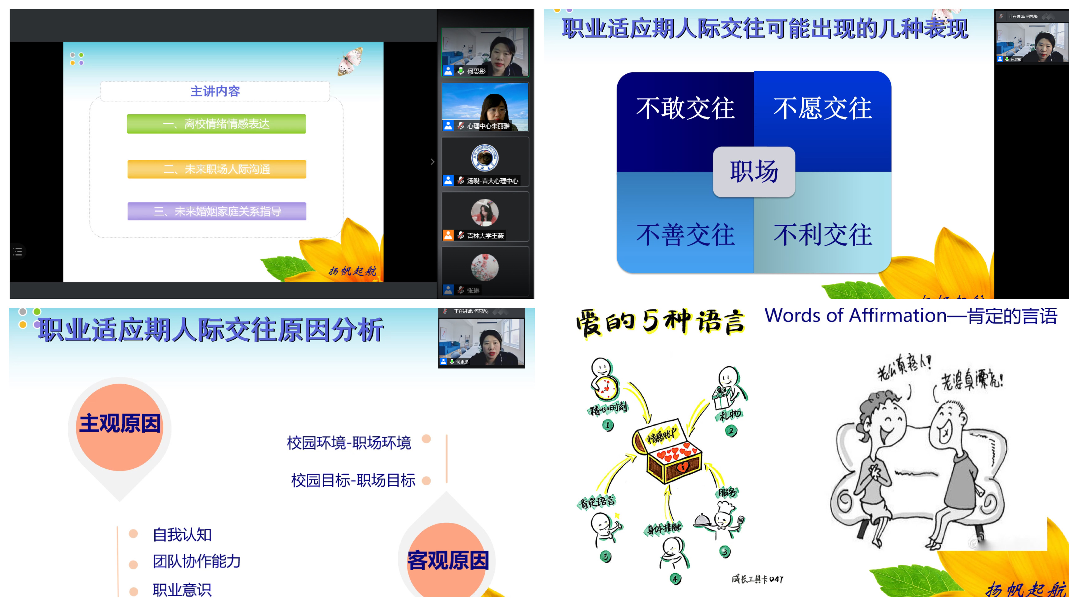 2021年度“心理健康教育月”系列活动包含四类、共七项活动。针对毕业生人群设计开展以“心之所向,扬帆起航”为主题的心理调适专题讲座;针对心理健康教育工作学生骨干队伍组织开展以“体验式沙盘在朋辈辅导中的应用”、“睡眠困扰人群的朋辈支持工作”为主题的开心使者工作论坛,多管齐下助力学生调节心态、增强朋辈工作技能。针对校内全体学生设计开展“我手画我心”原创绘画作品征集、“爱自己的浪漫史”原创诗歌征集活动和第七届“品味·心晴”心理微电影大赛,引导学生关注生活中滋养心灵的片段,勇敢探索内心世界,借助多种艺术表现形式分享温暖,传递正能量。组织实施以“健康心灵、助梦飞翔”为主题的大学生心理健康日现场活动,鼓励学生关注自身成长,相互分享,彼此赋能。组织开展“抓住未来,让梦想起飞”为主题的生涯规划团体心理辅导等面对面进行交流、互助的体验式活动,让心灵靠近心灵,让生命影响生命。心理健康教育月期间,同学们积极响应,热情参与,踊跃投稿,相关优秀作品已在中心网站(http://psy.jlu.edu.cn/)和“JLU吉大心声”微信公众平台进行展播。