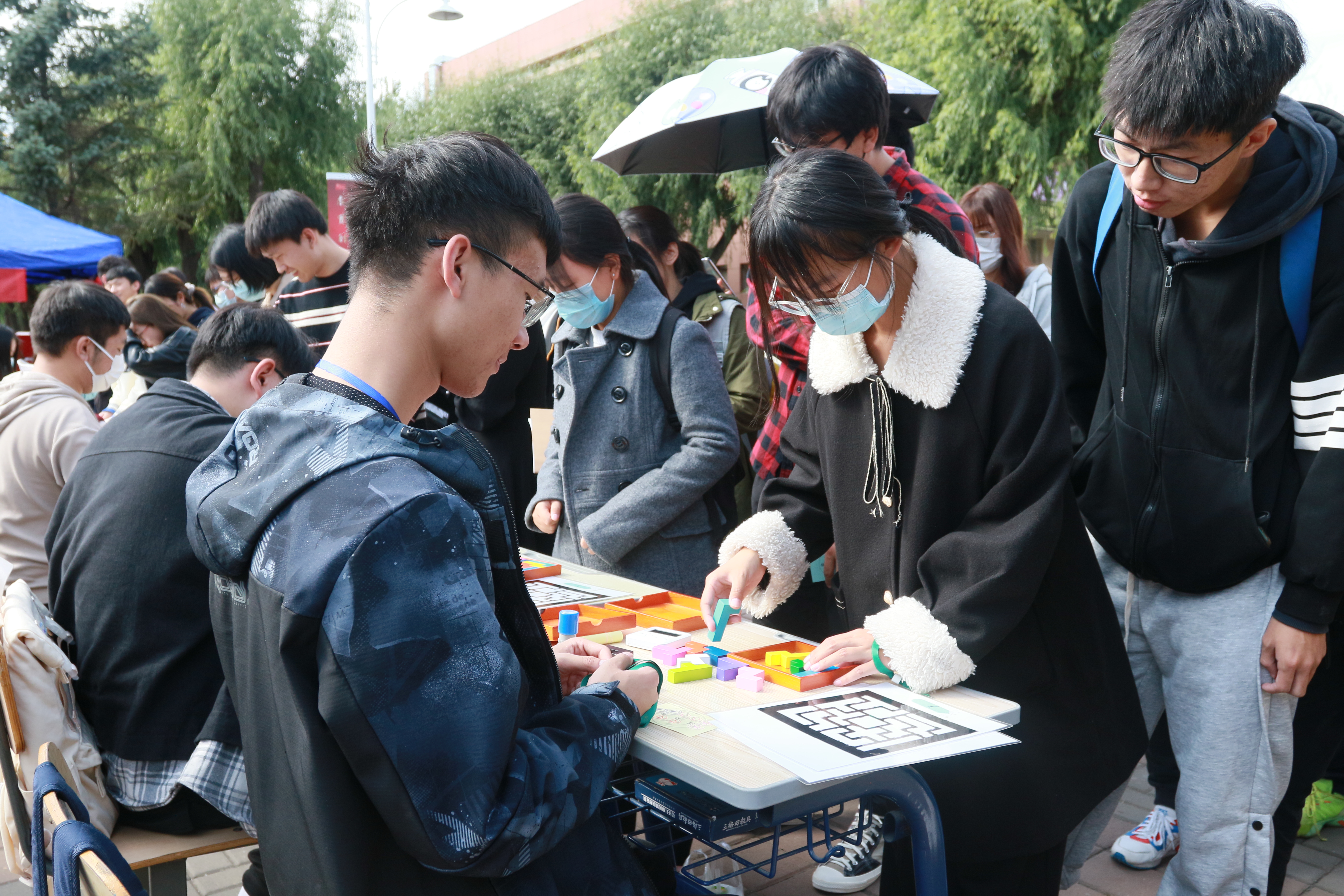 由吉林大学心理协会组织的心理集市包括心理自助锦囊发放、心理知识竞答、“忆决高下”、“心口不一”、“心灵手巧”、“披荆斩棘,心旷神怡”等系列心理游戏体验活动。“忆决高下”活动通过记忆并翻找颜色棋的形式帮助同学们健心健脑、增强以记忆为核心的心理优势;“心口不一”环节则以轻松愉快的“心理实验”形式,帮助同学们认识到利用心理规律对提高生活幸福感、学习效率,应对应激性心理变化的重要作用;而“心明眼亮”环节则是通过心理知识竞答的形式,考察同学们对心理健康知识的理解,增强同学们的心理自助能力;在“心灵手巧”环节,同学们通过拼摆木板图的方式,锻炼自己的手眼协调能力和自我意识的觉察与识别能力;最后,“披荆斩棘,心旷神怡”活动让同学们通过在趾压板上完成任务的游戏形式放松身心,增强逆境抗压及情绪调节能力。
