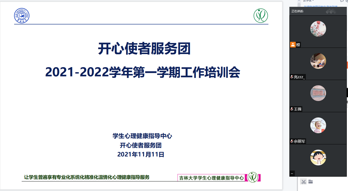 根据《2021年学生心理健康轴带教育指导计划》安排和《院级心理辅导室专业化发展支持计划》的工作要求,更好地开展朋辈团体辅导相关工作,学生心理健康指导中心于2021年11月11日召开了“开心使者服务团”2021-2022学年第一学期工作培训会,会议使用腾讯会议平台在线进行,学生心理健康指导中心张琳老师与开心使者服务团二十余位成员参加了此次会议。