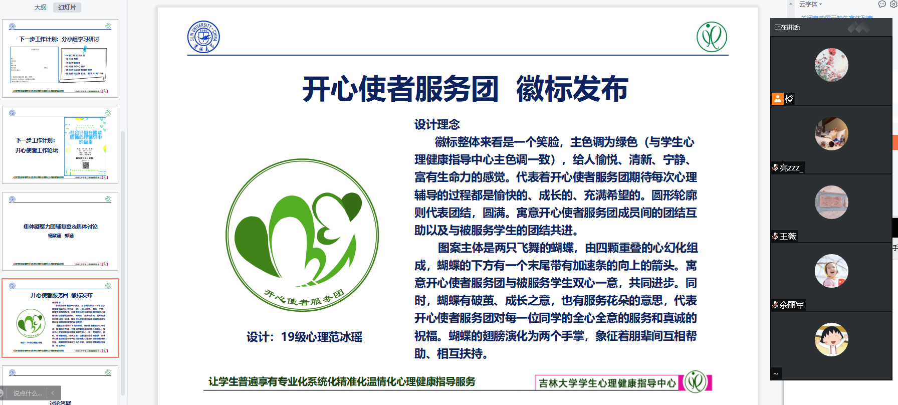 会议主要分为三个部分,首先张琳老师介绍了服务团本学期的工作进展,并安排了下个阶段的工作任务,在充分保障为学院提供相应团体辅导活动的基础上,为了进一步完善团体辅导方案,还将在服务团中进行小组合作式学习研讨,以小组合作形式完成对自选团体方案的设计、实施和调整,最终以小组报告形式在服务团中研讨完善。接下来,杨紫涵和郭涵两位同学对近期开展的“凝心聚力共成长”团体凝聚力心理辅导活动进行了复盘,对活动中的不足进行了反思总结,同学们通过集体讨论,提出了有针对性的调整方案。最后,会议发布了开心使者服务团徽标,徽标寓意同学们彼此支持,共同进步。