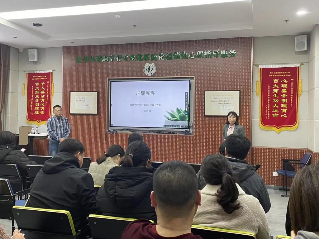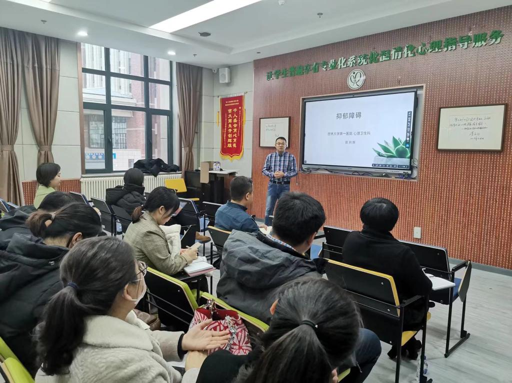 2021年11月30日下午,学生心理健康指导中心在中心校区鼎新楼C区228室开展第二期“心理医生会客室”,邀请吉林大学第一医院副教授、副主任医师田润辉开展主题为“抑郁障碍”的专题培训。学生心理健康指导中心专兼职教师、部分学院辅导员、研究生培养单位研究生秘书及校内教师参与了本次培训。