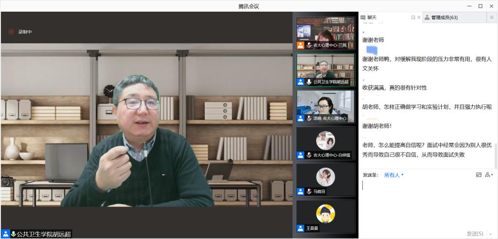 在线参加讲座的同学纷纷表示,胡老师的讲解深入浅出,调适方法实操性强,讲座答疑细致专业。本次讲座作为“12·25珍爱自己”关爱心理健康月的活动之一,主要聚焦了同学们毕业前这一特定阶段的心理需求,帮助同学们掌握心理自助技巧,主动缓解可能面临的心理压力和焦虑情绪,提升自我关爱意识,整理心态再出发。学生心理健康指导中心还将组织开展系列专题活动,向广大同学传递心理健康理念和知识,培养学生阳光心态。