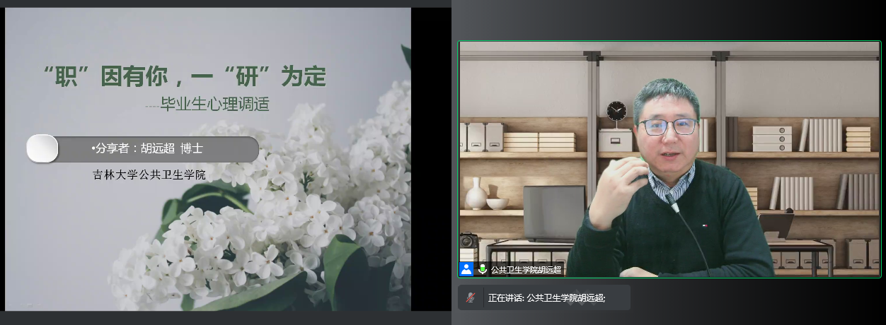 为帮助准备考研、就业的同学积极调节情绪、调整心态、规划生活,做好迎接人生新挑战的心理准备,学生心理健康指导中心于2021年12月6日组织开展了“职因有你,一研为定”线上心理调适讲座。讲座由公共卫生学院教师、中心心理咨询师胡远超老师主讲,学校80余名同学在线收听了讲座。