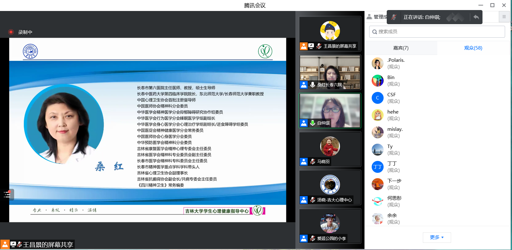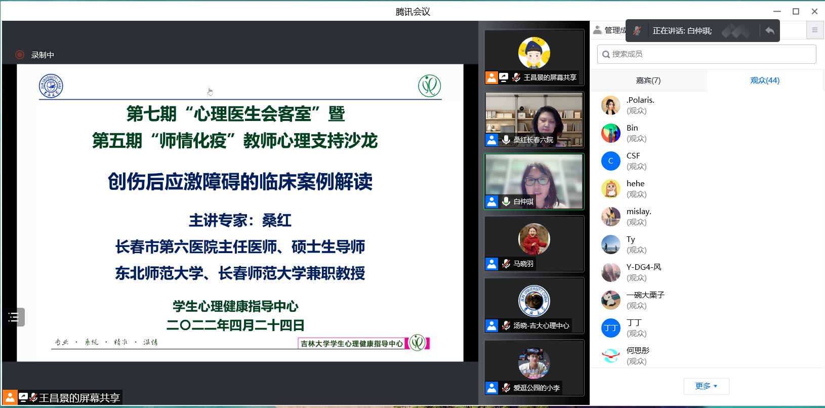 为加强学校封闭管理时期师生心理健康教育和服务保障工作,增强特殊时期医校沟通协作,2022年4月24日晚,学生心理健康指导中心邀请长春市第六医院主任医师、硕士生导师桑红教授通过腾讯会议平台线上开展了第七期“心理医生会客室”暨第五期“师情化疫”教师心理支持沙龙,沙龙主题为“创伤后应激障碍的临床案例解读”。学生心理健康指导中心专职教师,各校区心理素质培育基地心理咨询师,校内兼职心理辅导员、兼职心理健康指导教师,部分学院辅导员与研究生培养单位研究生秘书、校内教师110余人参加了此次沙龙。