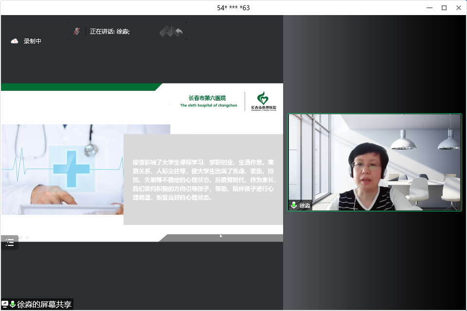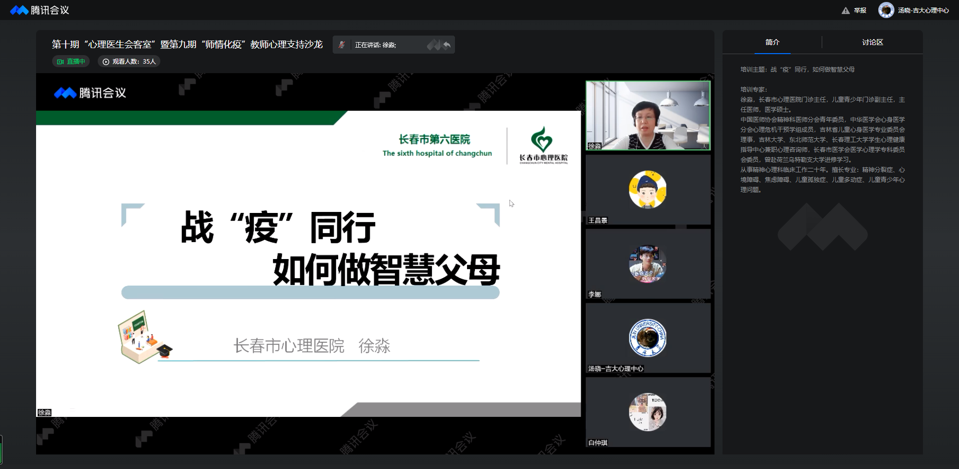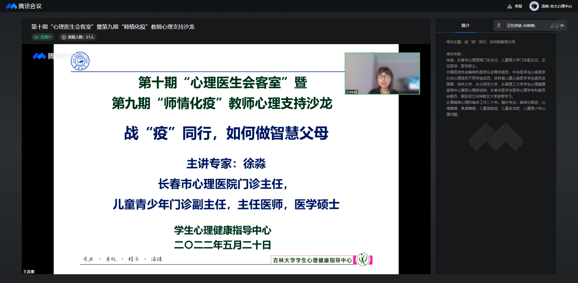 为充分发挥家长在学生成长中的正向引导作用,提升家-校-医共育合力,2022年5月20日晚,学生心理健康指导中心邀请长春市第六医院主任医师徐淼通过腾讯会议平台线上开展第十期“心理医生会客室”暨第九期“师情化疫”教师心理支持沙龙,主题为“战‘疫’同行,如何做智慧父母”。我校学生家长、学生心理健康指导中心专职教师,各校区心理素质培育基地心理咨询师,校内兼职心理辅导员、兼职心理健康指导教师,部分学院辅导员与研究生培养单位研究生秘书、校内师生参加了此次沙龙。