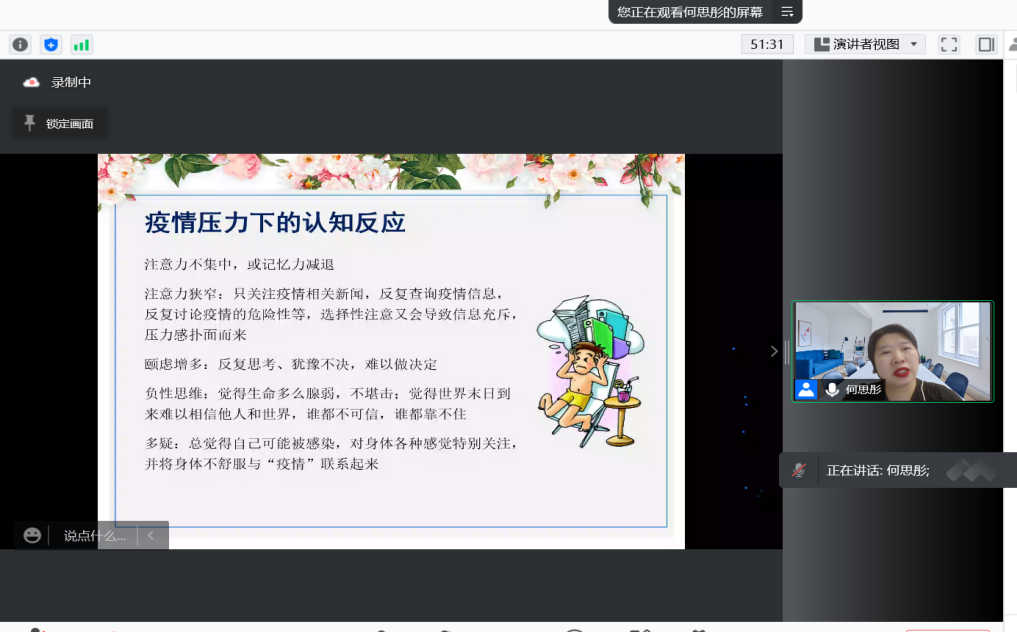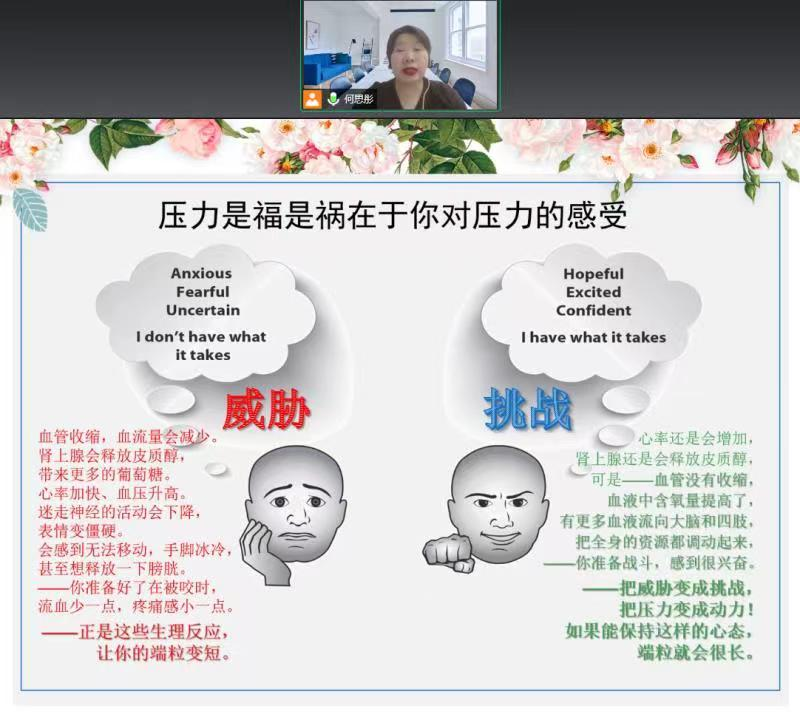 讲座中,何思彤教授首先细致地讲解了疫情压力影响下的身心反应。面对突然爆发的疫情,人们可能出现一些情绪反应、认知反应、行为反应或生理反应,使大家意识到很多身心反应都是应急事件下的正常反应,多数可自行调节。随后,何思彤教授结合感觉剥夺实验等案例科学地剖析了压力的四个来源以及特点,指出压力是人们对于威胁或挑战事件的身体和情绪反应,适当的压力是维持我们生命活动必要的外界刺激。在此基础上,何思彤教授讲解了压力的预警信号,面对压力时,要学会识别自身的压力预警信号,做到正确认识压力。最后,何思彤教授为大家分享了几个常用的压力管理技巧,讲座圆满结束。