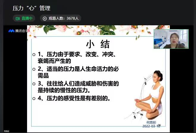 为科普心理健康知识,引导同学们关注自身疫情防控期间情绪变化、习得压力管理方法,根据《关于加强疫情防控期间学生心理支持工作的方案》的具体安排,2022年3月15日19时,学生心理健康指导中心通过腾讯直播举办了“压力‘心’管理”疫情期间心理调适专题讲座。本次讲座由学生心理健康指导中心何思彤教授主讲,近4000人参加讲座。