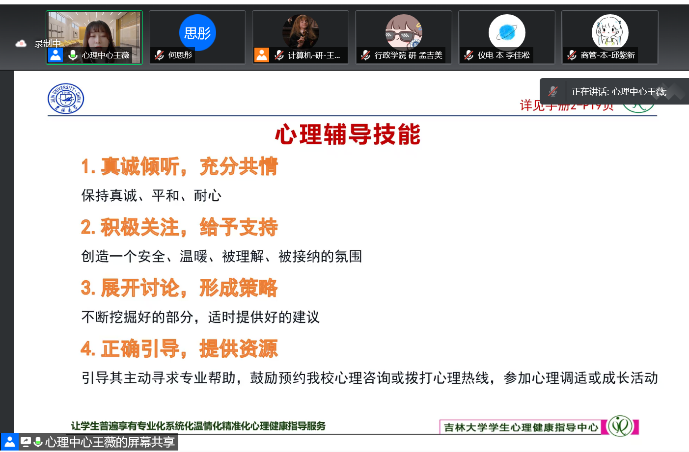 冬去暖未来,龙鳞覆春城。一场突如其来的疫情使刚刚恢复活力的校园再次归于宁静。在与病毒斗争的过程中,吉大人再次显现出了坚韧不拔的品质。值此疫情攻坚的重要时期,学生心理健康指导中心于2022年3月17日下午13:30-17:00举办了学生朋辈心理辅导员线上工作培训会,全校各学院、研究生培养单位的88名学生朋辈心理辅导员参加了本次培训。会议由心理中心何思彤老师主持,中心相关工作负责老师参与指导。