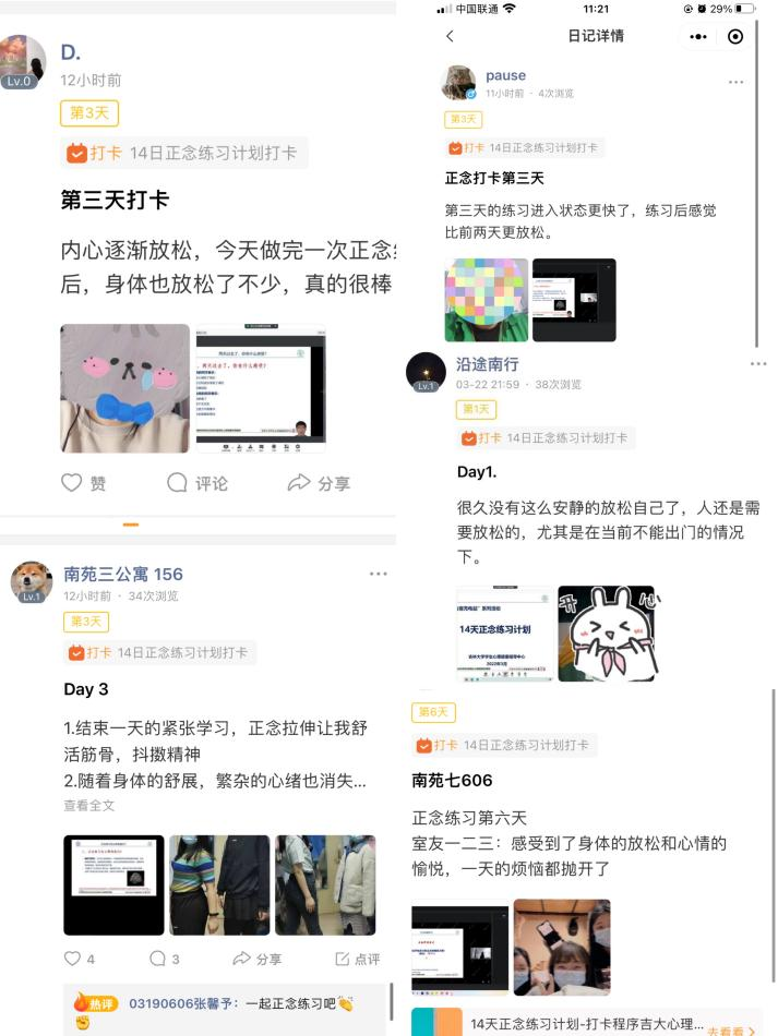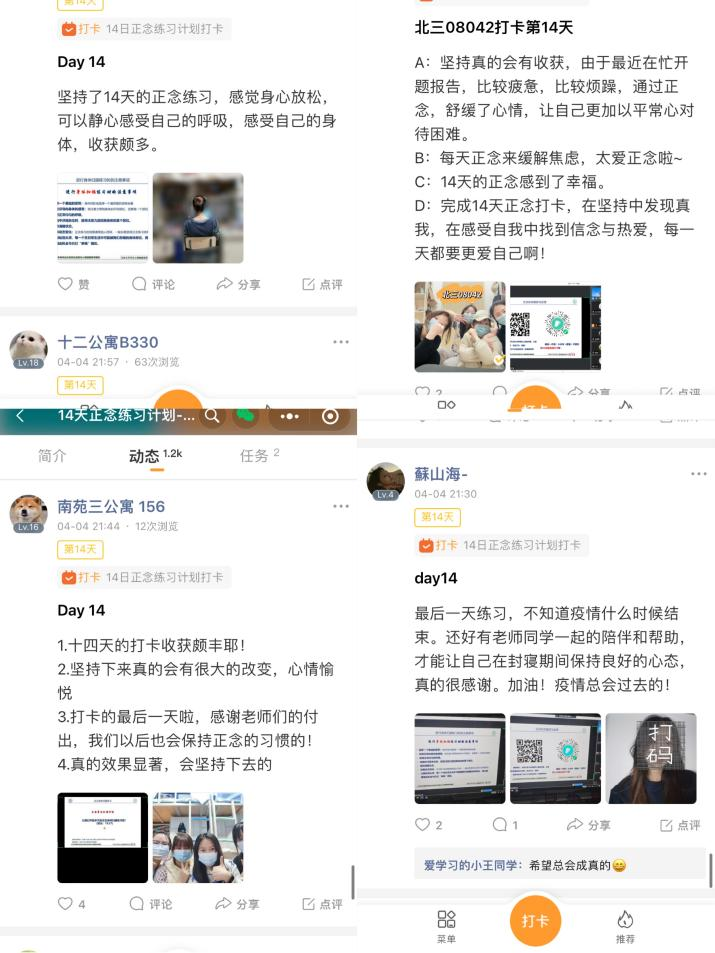 在小打卡小程序中,同学们表达了14天练习的感受和觉察,分享交流了各自的收获,有的同学表示,“坚持了14天的正念练习,感觉身心放松,可以静心感受自己的呼吸,感受自己的身体,收获颇多。”还有的同学说,“从正念练习中不仅仅放松了身心和缓解了压力,更是对情绪心境的提升,宿舍三人的默契和关系都更近一步,每天都轻松愉快!”。正如同学们所说,在老师的带领和讲解下,大家逐渐掌握了正念的原理和方法,在缓解压力的同时,也带来了稳定的身心感受,改善了睡眠质量,成为自我情绪调节和身心关照的有效策略。正念练习的同时,心理中心还特别鼓励学生以寝室为单位进行集体打卡,引导学生增加坚持动力、增进互相支持、增强寝室凝聚力。