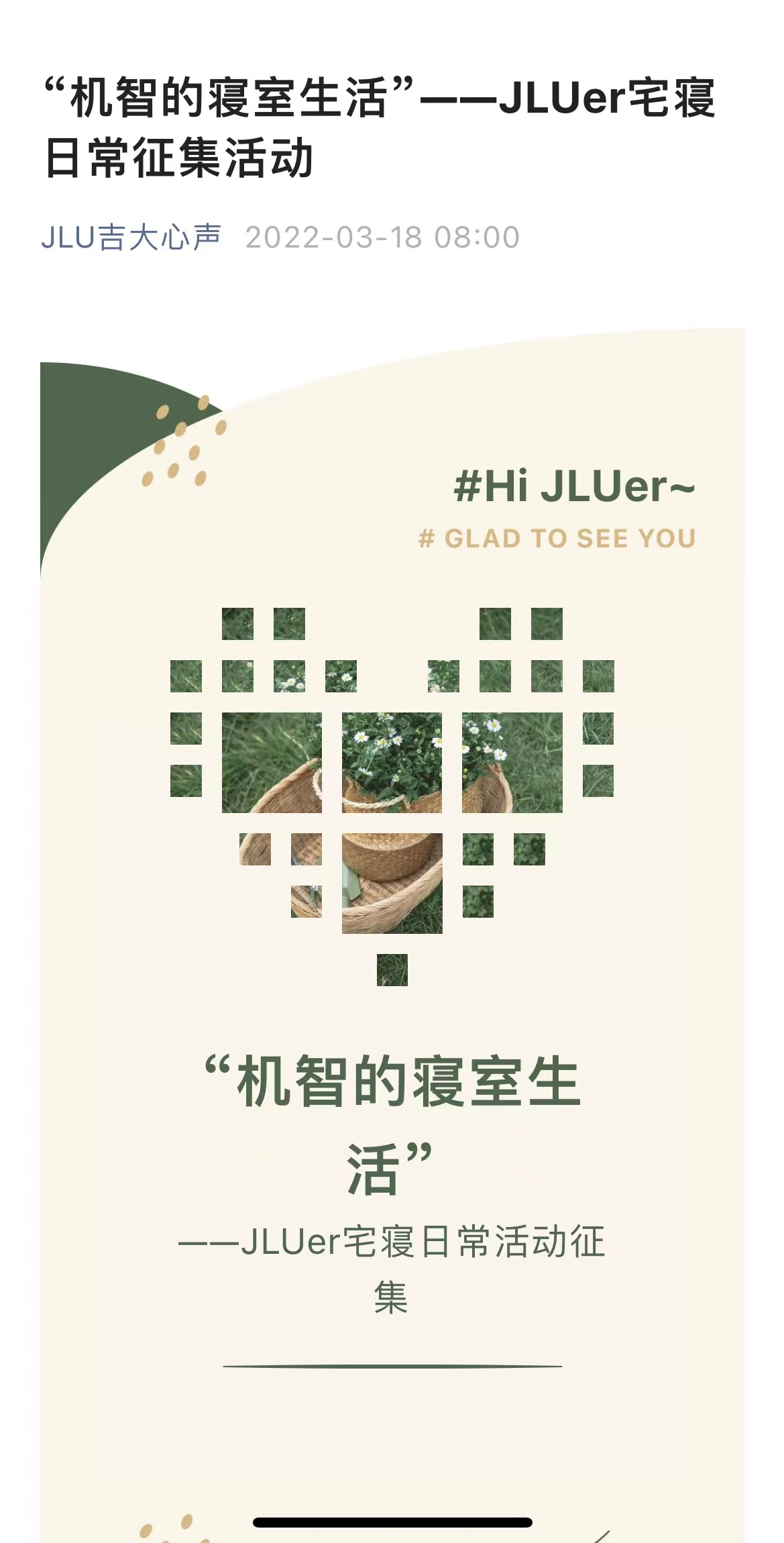 为了引导同学们同心抗疫,发现寝室生活闪光点,提升对自己、他人的积极关注,提高寝室凝聚力,学生心理健康指导中心根据“3·25(善爱我)心理健康指导月”暨疫情期间“心”支持系列活动工作安排,指导各学院及研究生培养单位开展了“机智的寝室生活”JLUer宅寝日常作品征集活动。