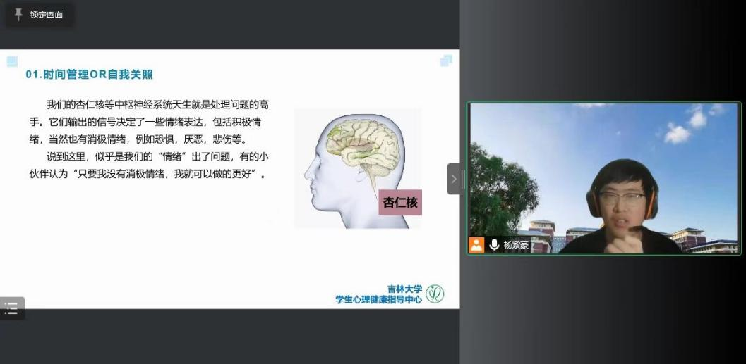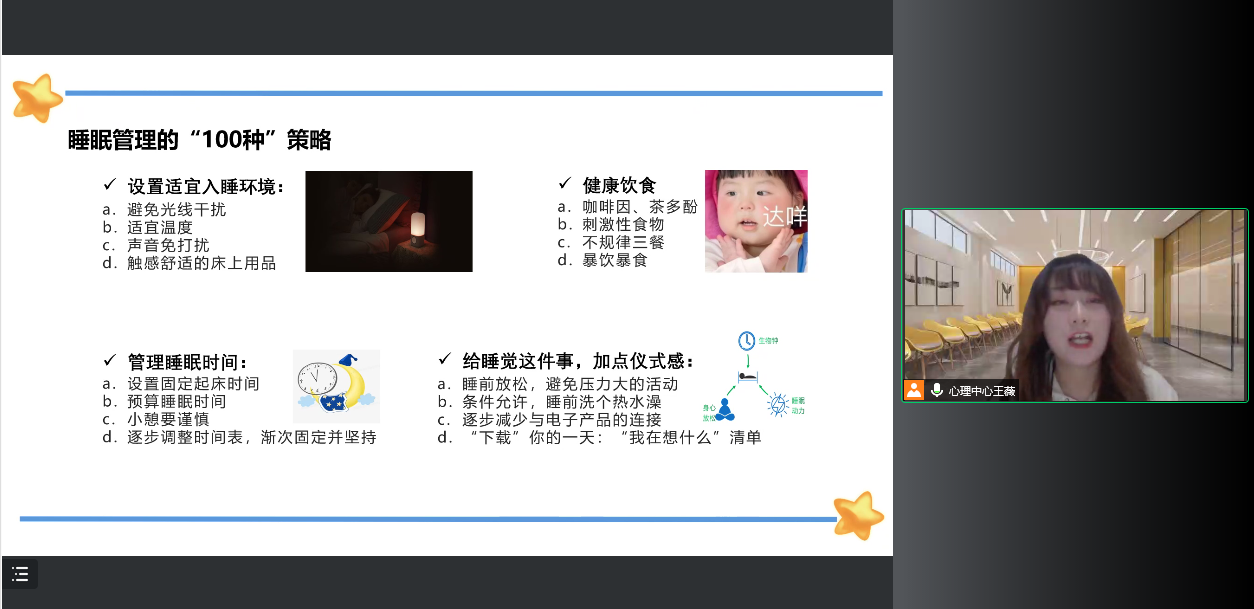 活动期间共开展五期“线上心理沙龙”。4月5日的第一期沙龙中,心理中心何思彤老师以“用‘聊天’的方式与你相愈”为主题从疫情当下的心理状态出发探讨了特殊时期人际沟通的重要性,在讲解人际沟通中底层逻辑的基础上分享了促进沟通,改善情绪的技巧与方法。4月10日的第二期沙龙中,心理咨询师杨紫豪老师与同学们分享了“疫情下的时间管理策略”,并从科学的时间管理和精力管理角度探讨了疫情下实用的自我关照策略。第三期沙龙于4月13日开展,余丽军老师以“情绪调节策略”为主题,强调“看见情绪就是一种疗愈”,在帮助大家更好地认识情绪基础上,分享了情绪调节的方法和心理支持资源。第四期沙龙聚焦于疫情下的“自我关怀”,于4月18日开展,张琳老师对自我关怀的理念进行解读,并分享了如何在应对困难与挫折过程中培养自我关怀意识和方式。第五期沙龙则于4月21日进行,王薇老师以“好好睡觉——疫情下的睡眠管理策略”为主题,与同学们分享了科学的睡眠相关知识和睡眠管理的多种策略,同学们互动热烈。