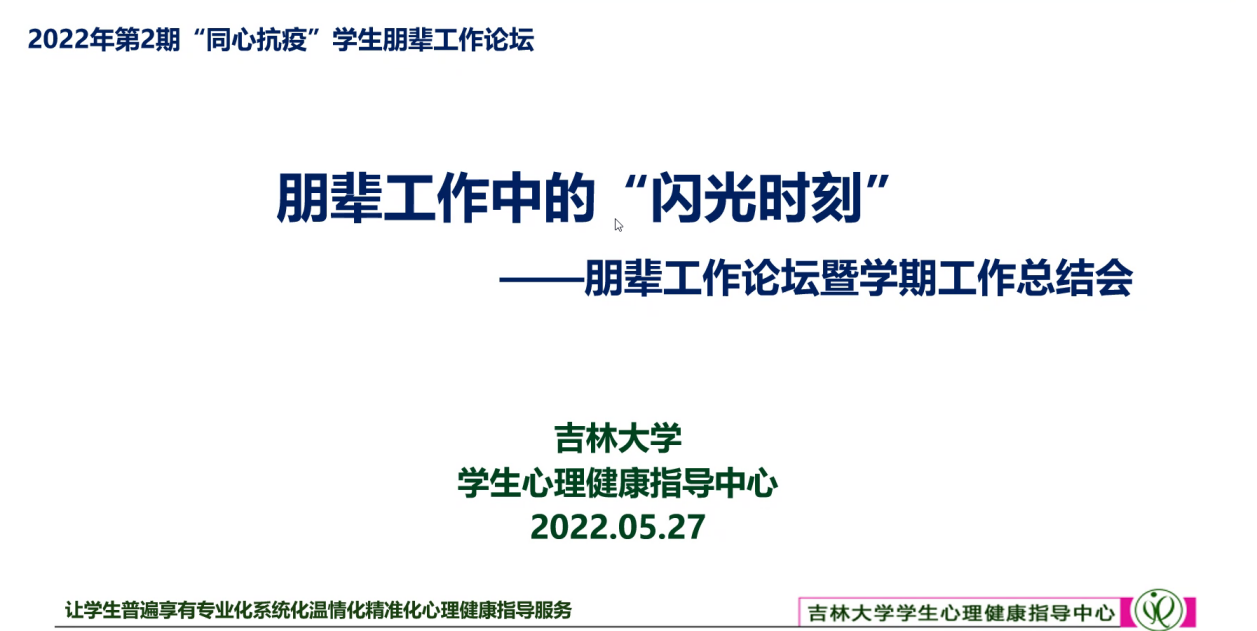 根据《2022年学生心理健康轴带教育指导计划》和“5·25(我爱我)”心理健康教育月系列活动的相关工作安排,为加强心理健康教育工作学生骨干队伍建设,提高队伍素质能力,加强朋辈经验交流,相互促进、共同发展,学生心理健康指导中心于5月27日9:00举办了2022年第二学期“同心抗疫”学生朋辈工作论坛暨学期工作总结会。在疫情严格防控的环境下,由学生心理健康指导中心教师通过线上会议的形式,带领各学院学生朋辈进行学习与讨论。