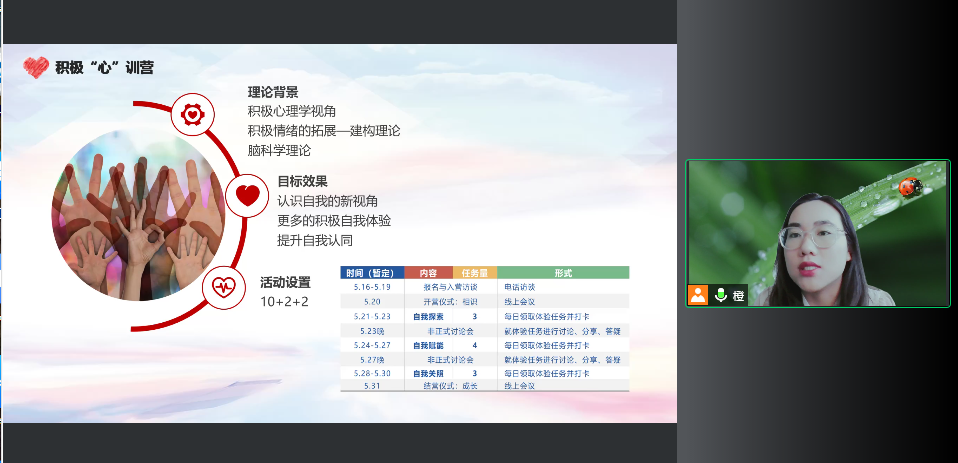 活动于5月16日在“JLU吉大心声”微信公众平台进行宣传预热并开启报名,同时针对报名同学进行入营访谈,最终确定30位成员入营体验。为了促进成员彼此熟悉,建立安全稳定的关系氛围,5月20日全体成员参加了开营仪式。5月21-5月23日便进入到第一个“自我探索”模块的体验任务,引导同学们增加身心觉察,挖掘自身优势资源,并在23日晚开展第一次非正式讨论会,为同学们提供对初体验的感受分享和答疑平台。5月24日-5月27日进行不同主题的“自我赋能”练习,引导同学们学会自我肯定、自我“充电”,并针对前两个模块的“例外发现”与特殊卡点在27日晚上开展第二次非正式会谈。第三个模块是充满能量的“自我关照”,启发同学们借助心理学策略多给予自我关怀,最后于5月31日晚在对此次活动历程回顾总结、觉察提升、成长见证中顺利结营。