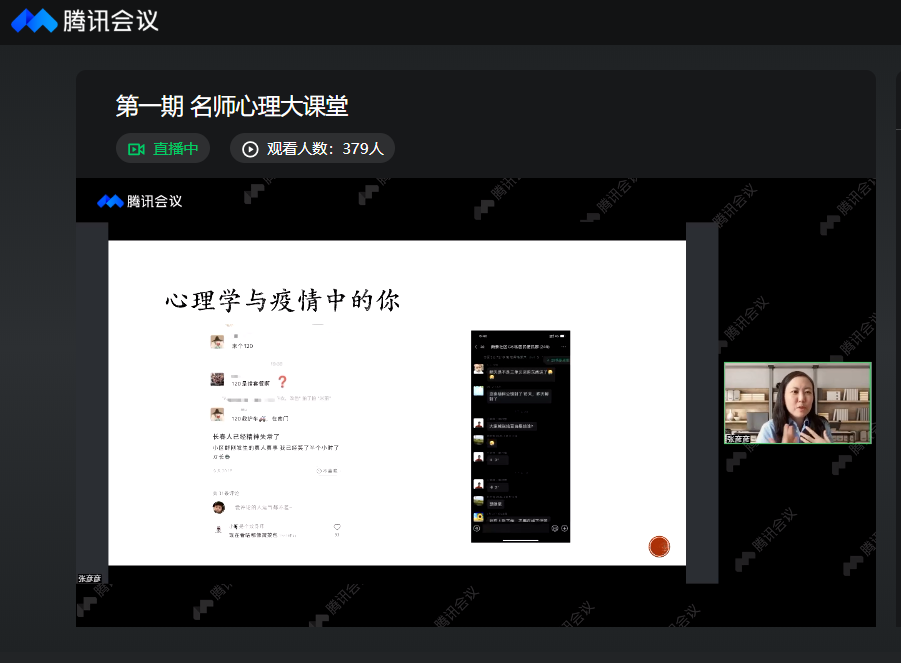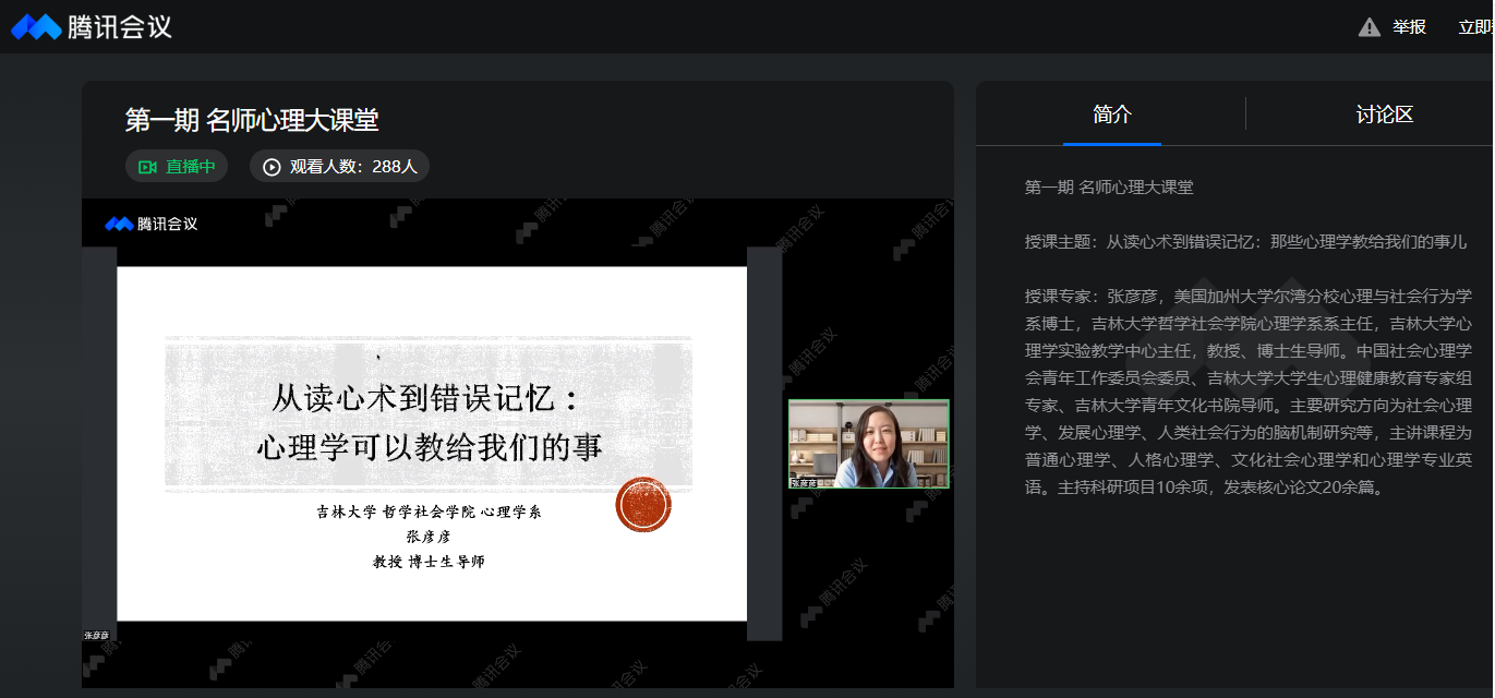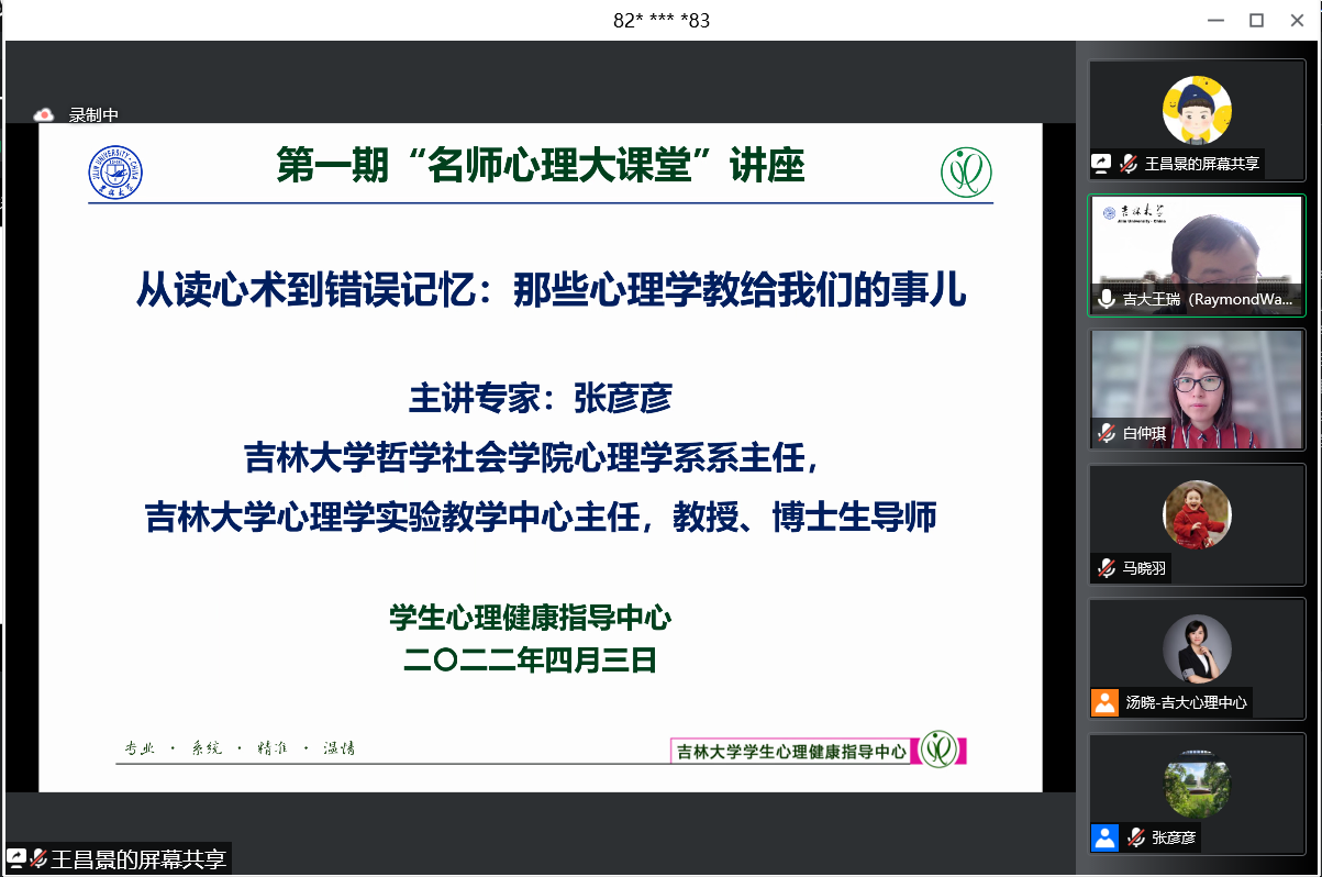 为提升学生疫情期间心理适应能力,引导学生更加积极、阳光主动地应对学习生活变化,学生心理健康指导中心于4月3日上午开展第1期“名师心理大课堂”。讲座邀请吉林大学哲学社会学院心理学系主任张彦彦教授主讲,授课主题为“从读心术到错误记忆:那些心理学教给我们的事儿”。校内共计380余人次通过腾讯会议、直播平台在线学习。