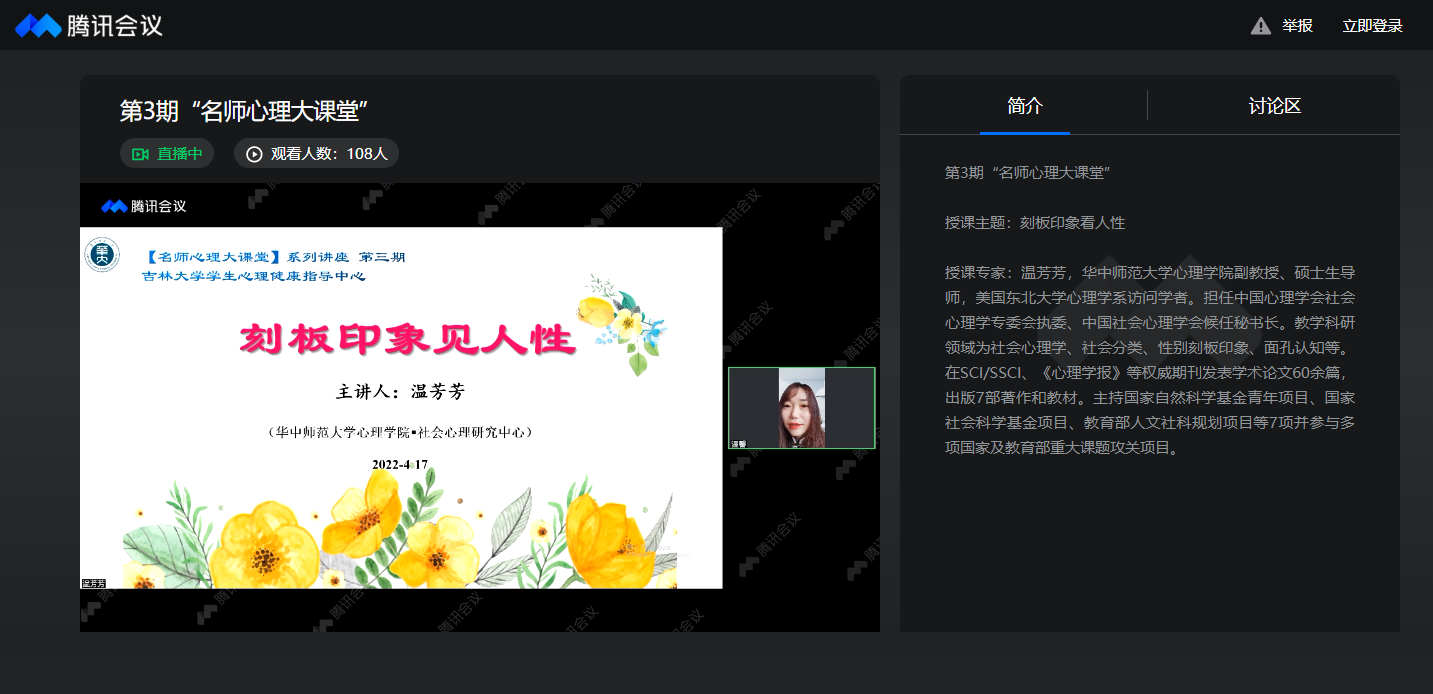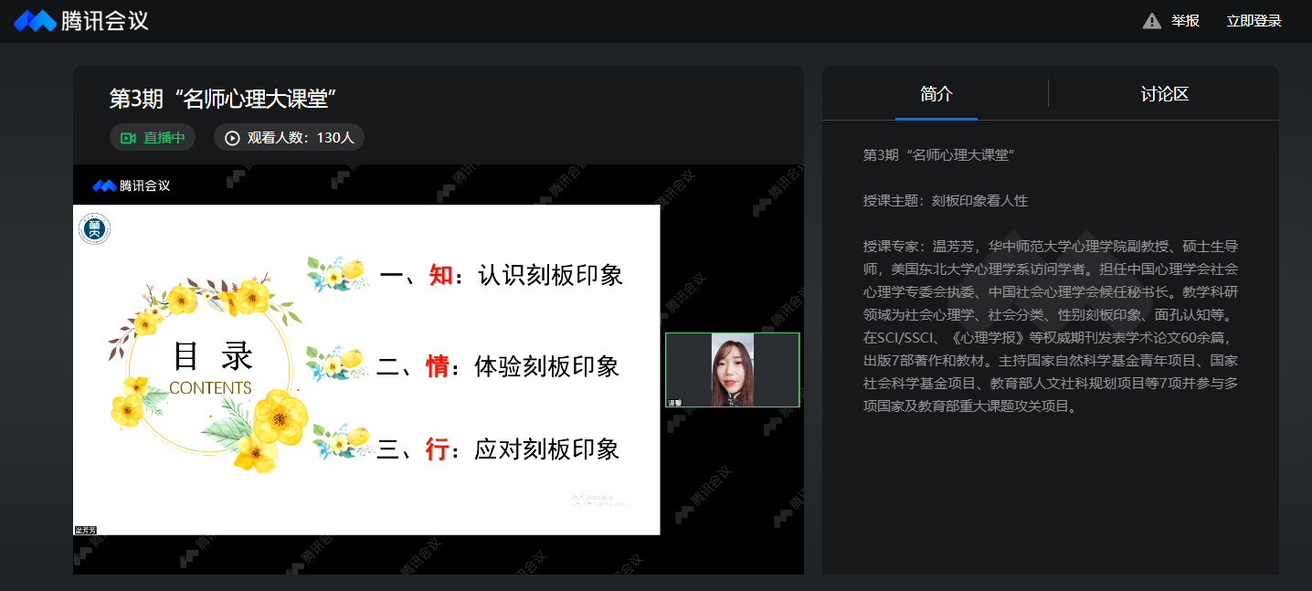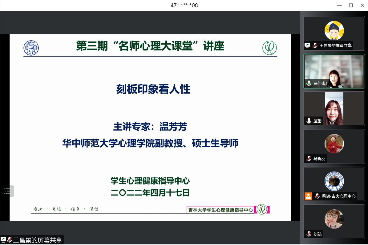 为提升学生疫情期间心理适应能力,引导学生更加积极、阳光主动地应对学习生活变化,学生心理健康指导中心于4月17日上午开展第三期“名师心理大课堂”。讲座邀请华中师范大学心理学院温芳芳副教授主讲,授课主题为“刻板印象看人性”。校内共计130余人次通过腾讯会议直播平台在线学习。