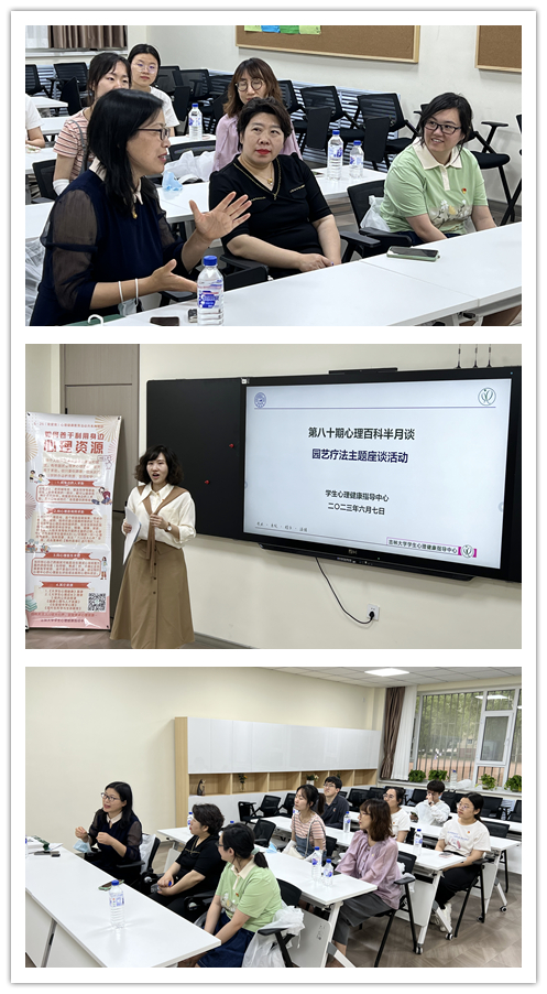 为进一步落实教育部等十七部委《全面加强和改进新时代学生心理健康工作专项行动计划(2023—2025年)》文件精神,加强学生心理健康指导中心与各学院的学习交流,“以美润心、以劳健心”研究探索植物、园艺与心理育人的融合教育途径,2023年6月7日,学生心理健康指导中心围绕主题教育亮点工作内容,在和平校区开展了第八十期心理百科半月谈活动。