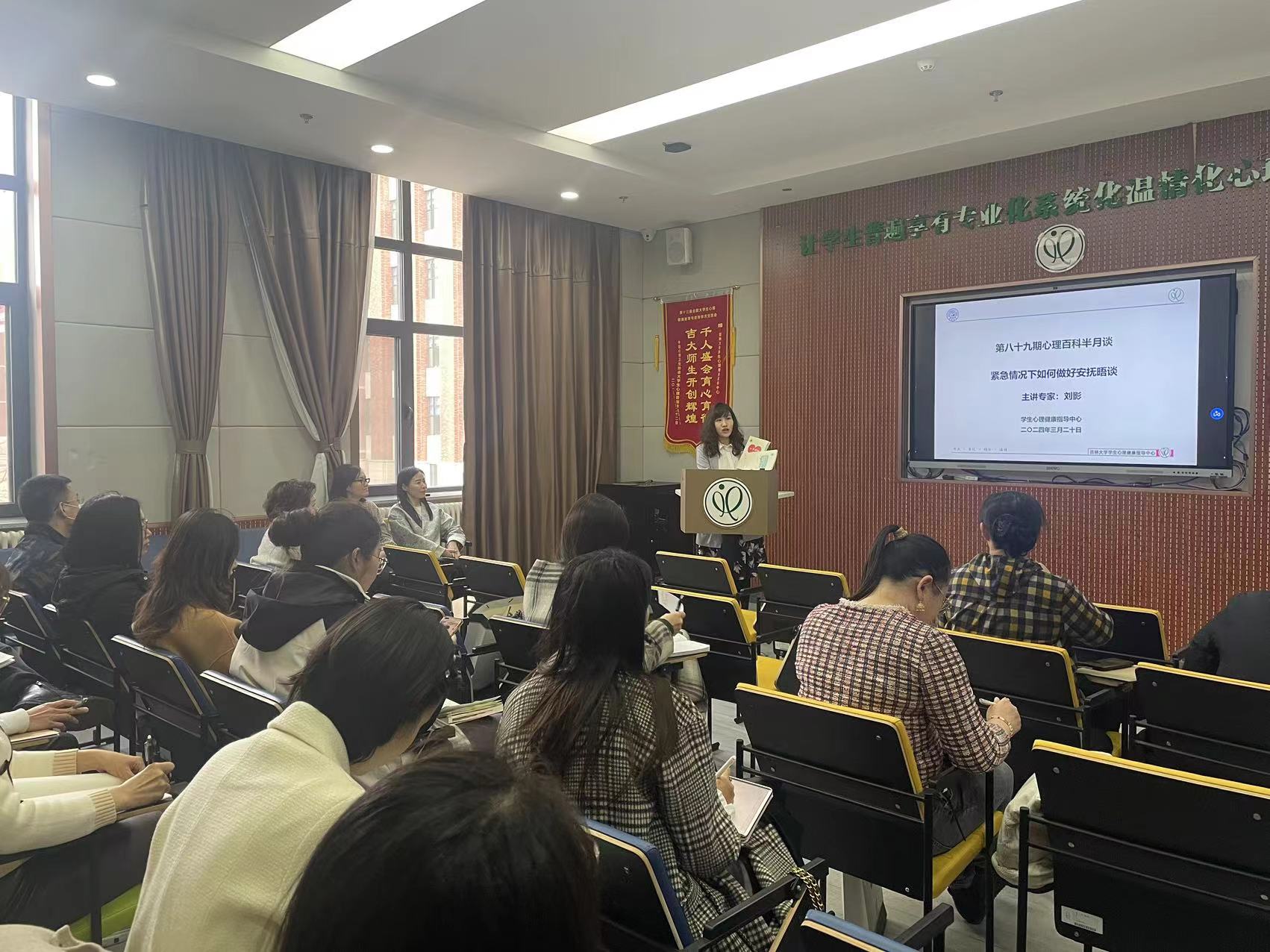 为深入推进“时代新人铸魂工程”,进一步落实教育部等十七部委《全面加强和改进新时代学生心理健康工作专项行动计划(2023—2025年)》文件精神,提升辅导员深度辅导谈心谈话技能,学生心理健康指导中心于2024年3月20日举办了第八十九期心理百科半月谈专题培训,主题为“紧急情况下如何做好安抚晤谈”。培训由心理中心兰岚老师主持,我校学生工作干部、兼职心理健康指导教师、心理健康教育教师及其他教职工等40余人参与了本次培训。