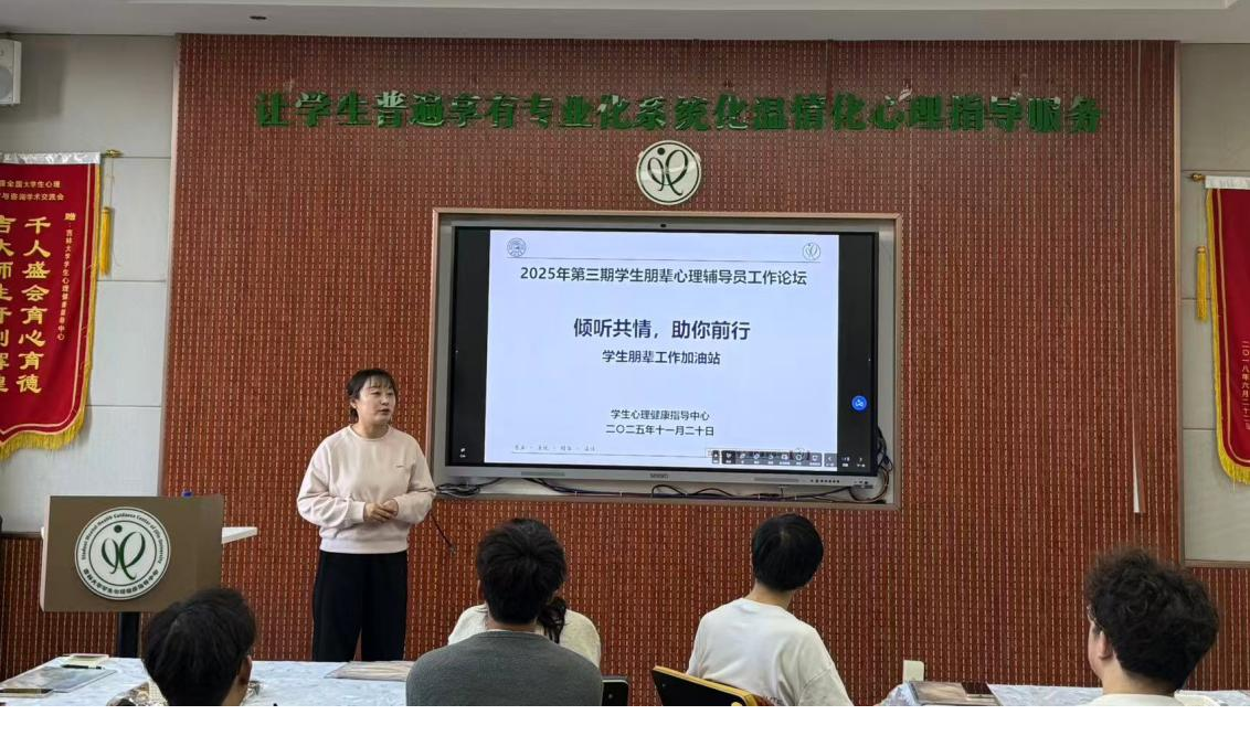 按照《2025年学生心理健康轴带教育指导计划》工作安排,为进一步提升学生朋辈心理辅导员的专业素养和工作能力,着力打造适应新时代心理健康教育工作的学生骨干队伍,学生心理健康指导中心于2025年11月20日下午组织开展了2025年第三期学生朋辈心理辅导员工作论坛,各学院、研究生培养单位共计24名学生朋辈心理辅导员参加。