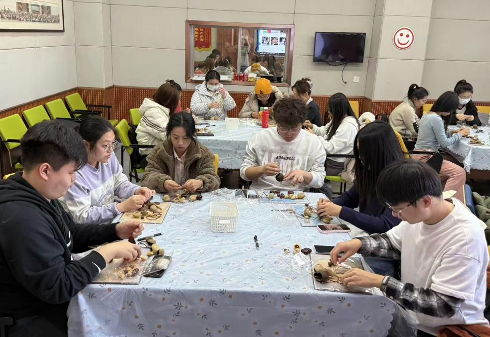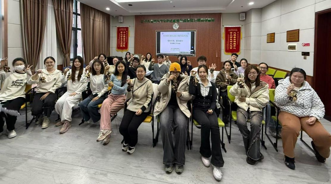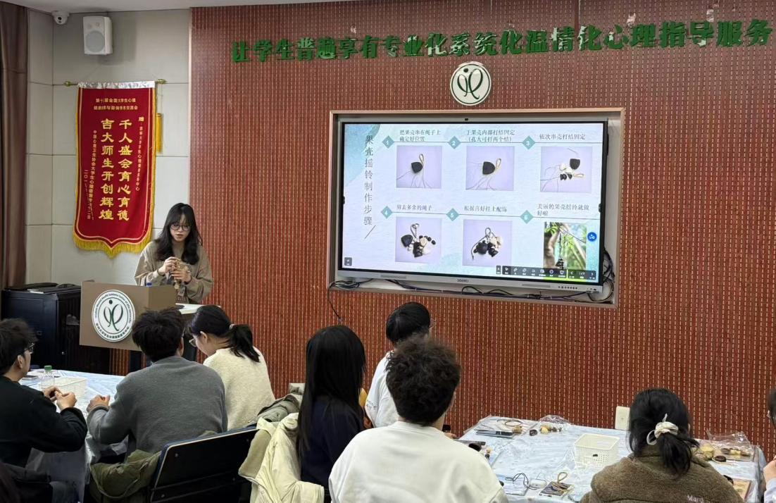 在技能培训后,哲学社会学院研究生朋辈心理辅导员李牧鸽带领朋辈们进行了“果壳手摇风铃制作”的实践体验。各学院朋辈心理辅导员通过感受自然材质、手工拼接组装等环节,在专注创作中体验心理放松与自我疗愈,同时将亲手制作的风铃作为朋辈陪伴的“情感载体”,探索了心理关怀从“语言疏导”到“体验式联结”的新形式。