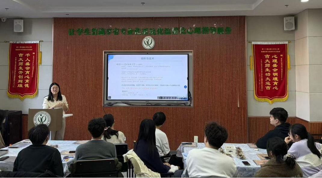 本次培训由心理中心指导教师王薇主持。心理中心余丽军以“倾听与共情能力提升”为题,与大家分享了朋辈辅导中的重要工作技能。余老师先以生活情境为例,结合影视作品,引出心理咨询中倾听的重要性,并详细介绍了倾听的七个技巧;然后采用对话练习的方式,帮助大家理解共情的五个水平,并教授大家如何将共情与倾听相结合,向求助者传达共情的情感反映;最后,她带领朋辈进行了小组练习,帮助大家提升自我感受力。