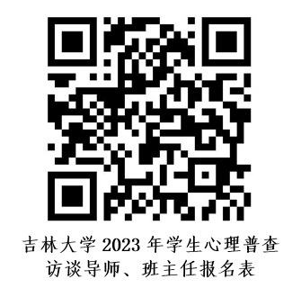 2.请各单位有意愿参加并完成心理访谈的导师和班主任于10月18日中午12:00前扫描下方二维码,填写《吉林大学2023年学生心理普查访谈导师、班主任报名表》,并扫描问卷中的二维码加入导师班主任工作群。2023级本(预)科生、研究生辅导员无需填写报名表,请协助中心尽量宣传动员新生导师和班主任参与到普查访谈工作中。